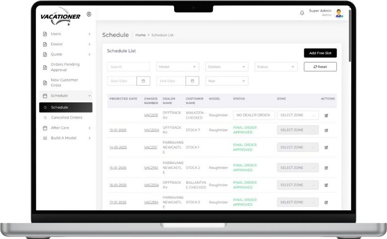 Vacationer Caravans is one of Australia’s leading manufacturers of luxury caravans, renowned for their innovative designs and superior quality. With a growing network of dealers and sales teams, the company required a robust digital platform to streamline its production management, sales operations, and after-sales service processes.